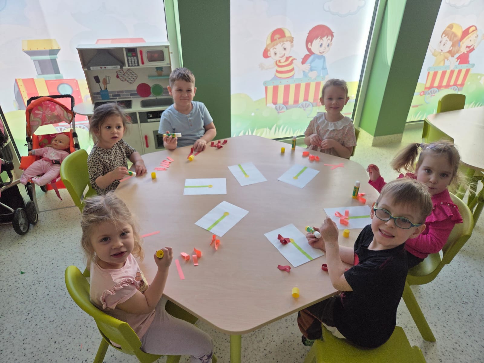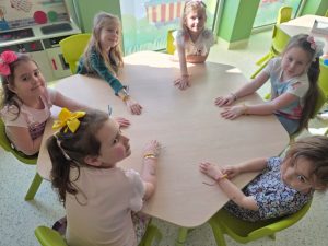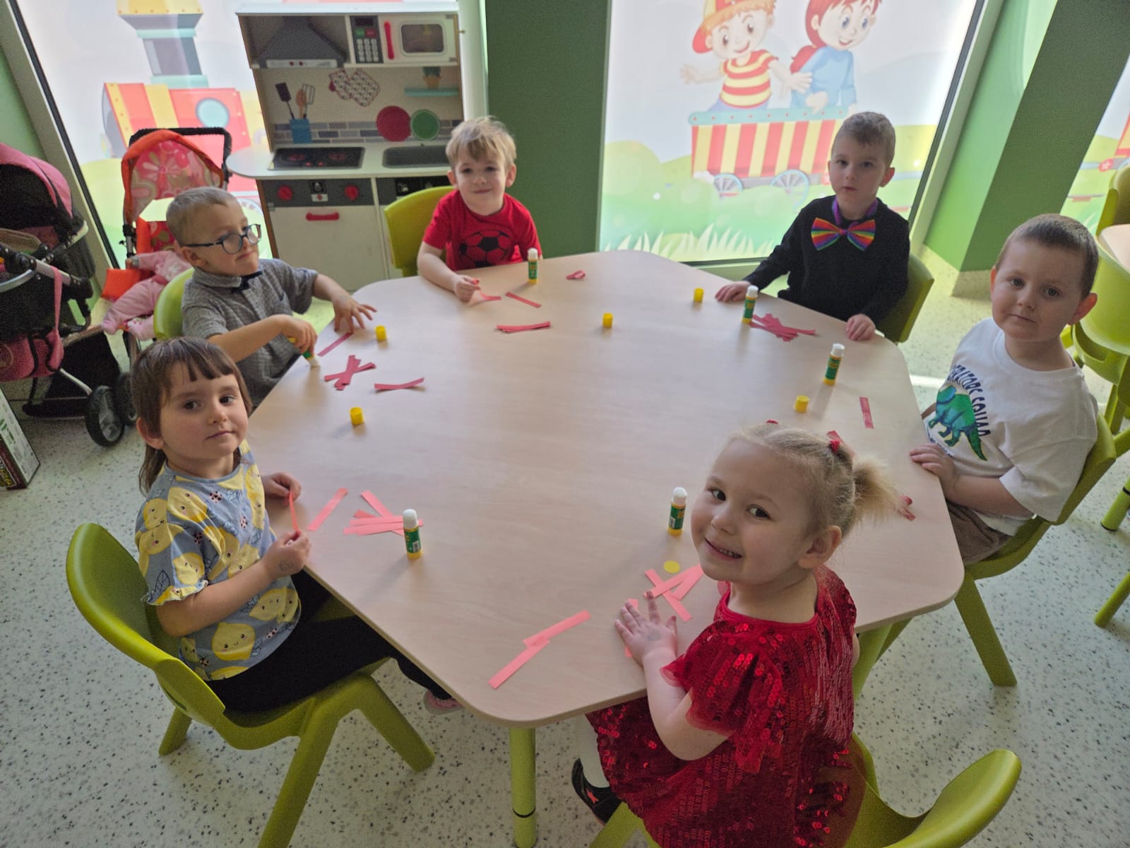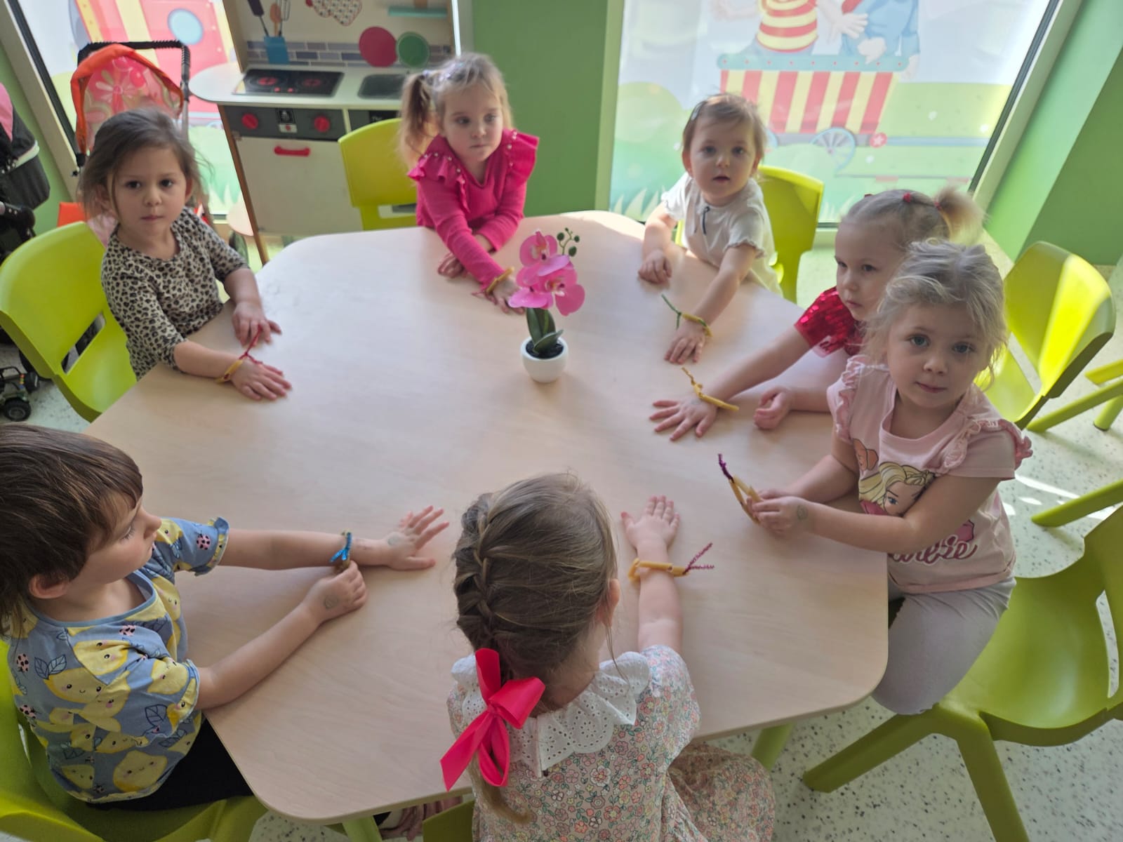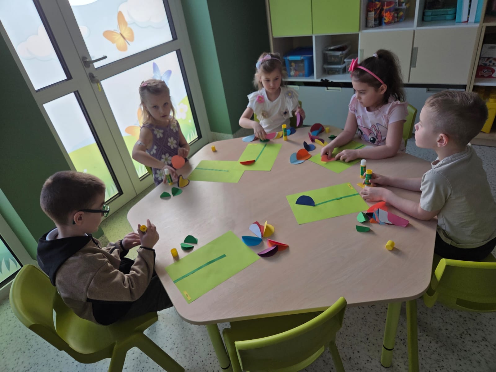 Podczas zajęć dzieci z wielkim zaangażowaniem tworzyły własnoręcznie papierowe kwiaty oraz eleganckie bransoletki. Każda praca została przygotowana z ogromną starannością, stając się wyrazem wdzięczności i sympatii dla koleżanek oraz kolegów.