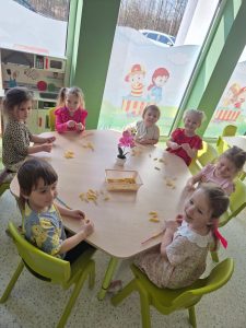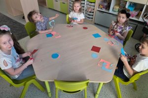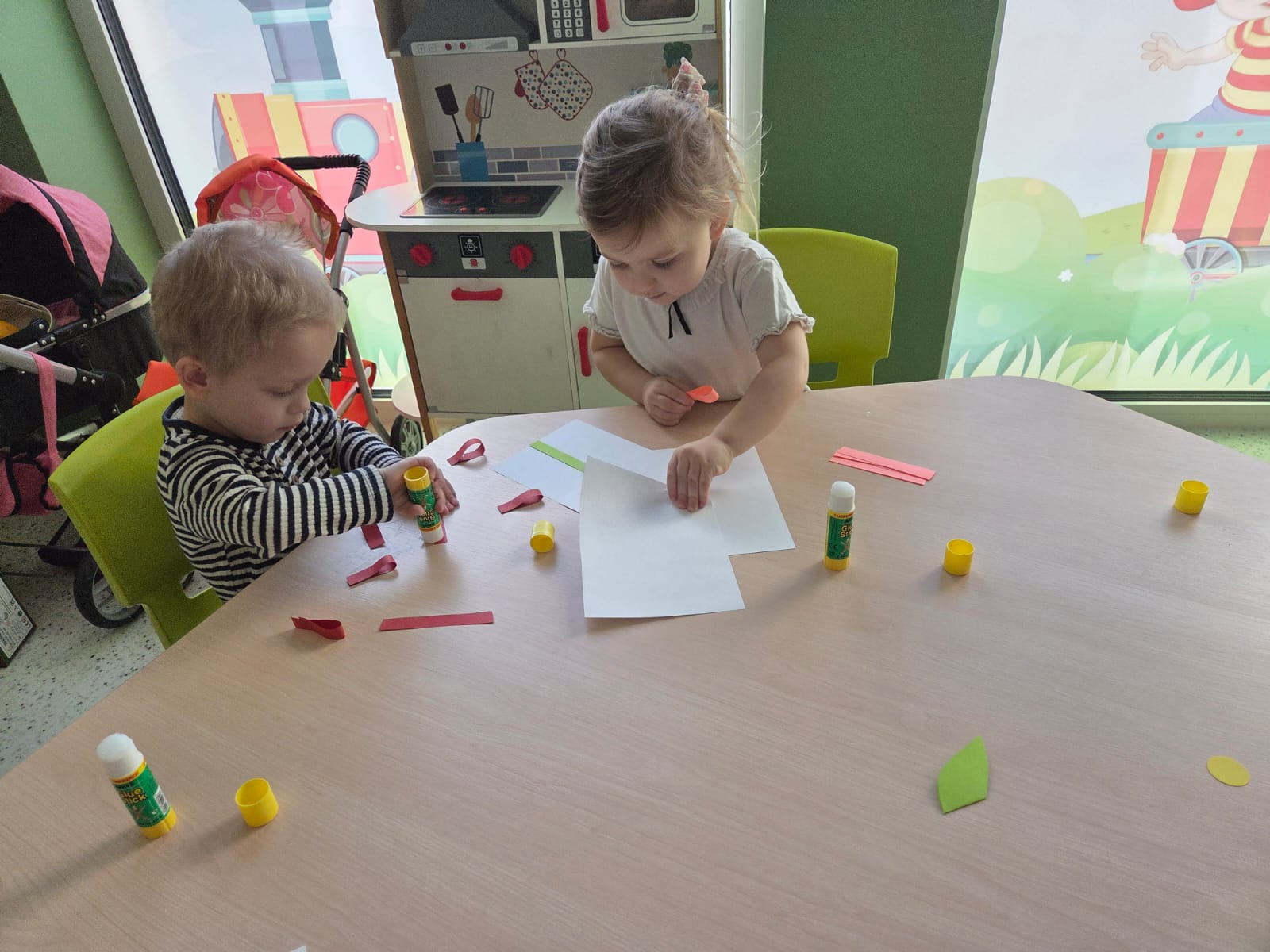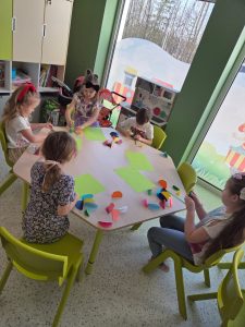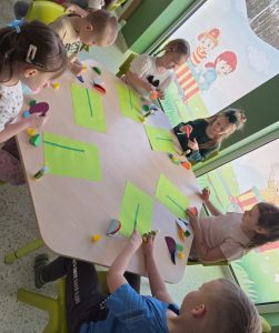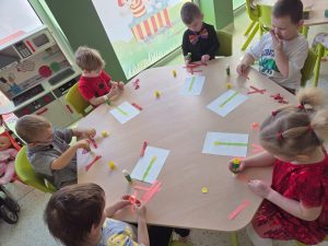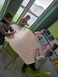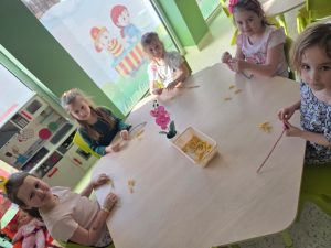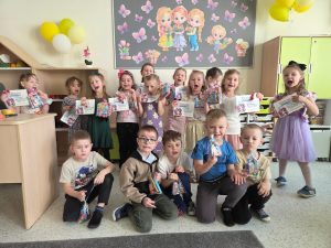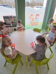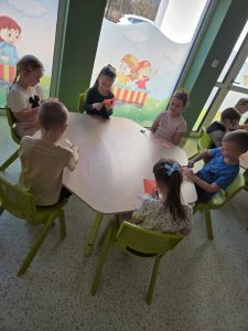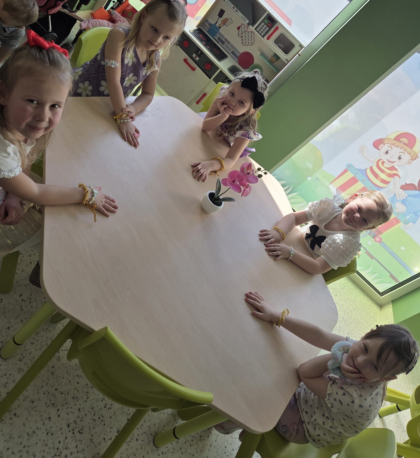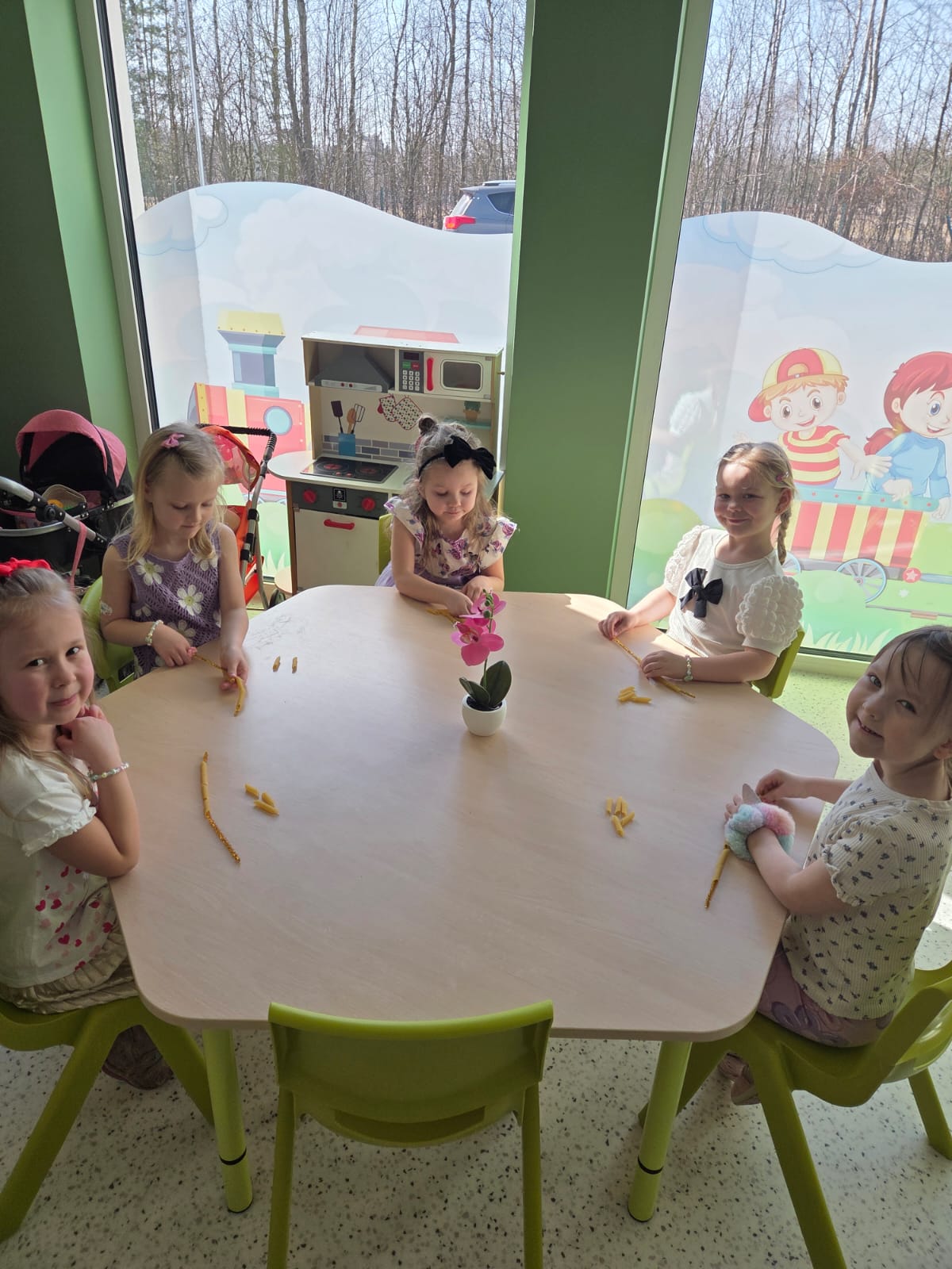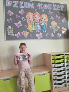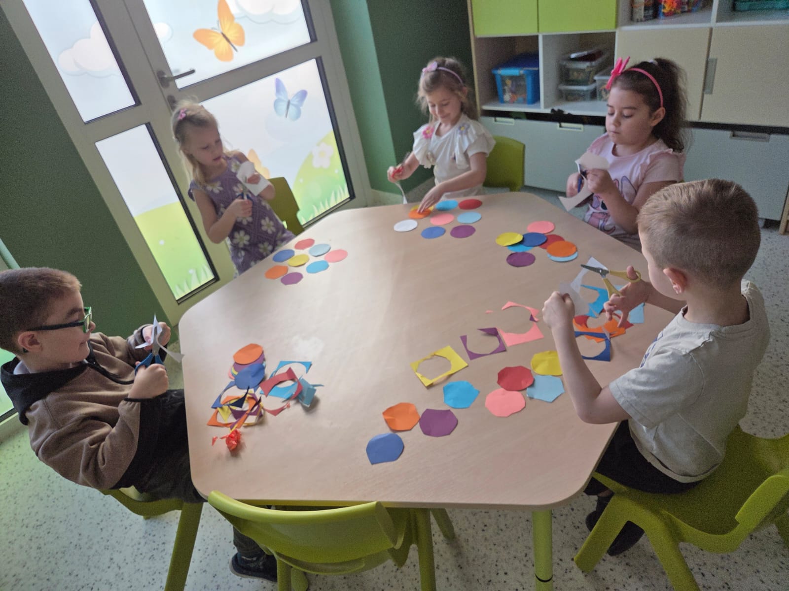 Podczas zajęć dzieci z wielkim zaangażowaniem tworzyły własnoręcznie papierowe kwiaty oraz eleganckie bransoletki. Każda praca została przygotowana z ogromną starannością, stając się wyrazem wdzięczności i sympatii dla koleżanek oraz kolegów.