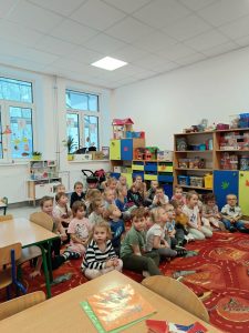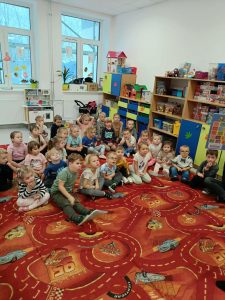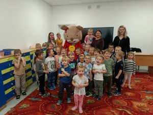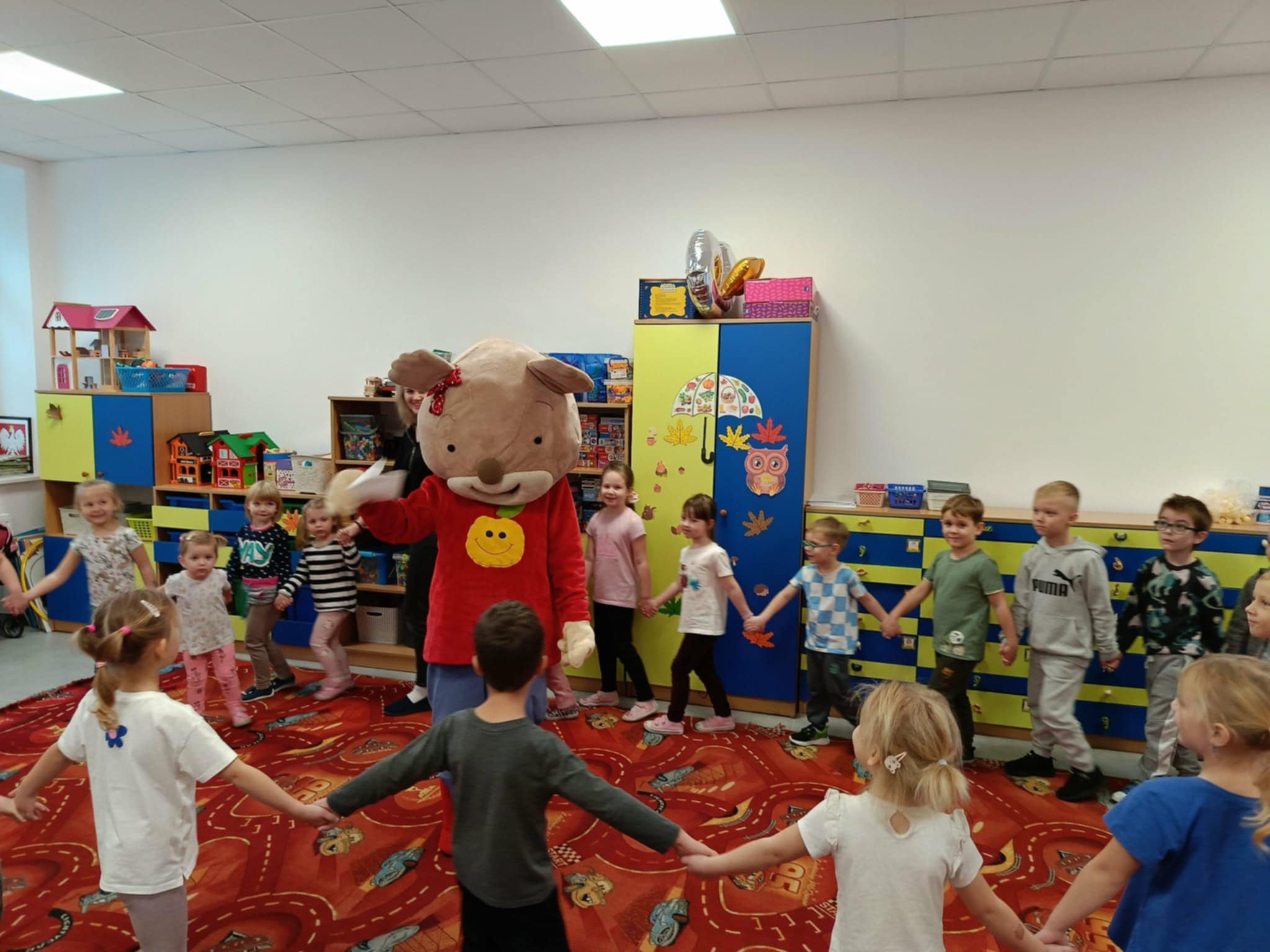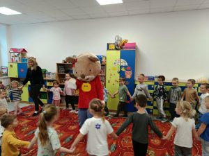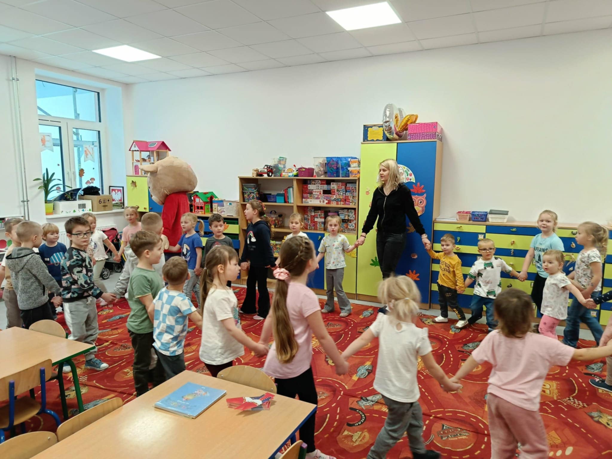 Mieliśmy zaszczyt gościć Dyrektor Gminnej Biblioteki Publicznej w Brzózie Stadnickiej – panią Małgorzatę Babiarz. Pani Dyrektor przeniosła najmłodszych w zimową krainę, czytając bajkę „Misia Marysia na nartach”. Dzieci słuchały z zapartym tchem! Po wysłuchaniu lektury nadeszła pora na najcudowniejszą niespodziankę tego dnia – prawdziwa Misia Marysia odwiedziła nasze przedszkole! Wszyscy z radością wzięli udział w zabawach zaproponowanych przez niezwykłego gościa.