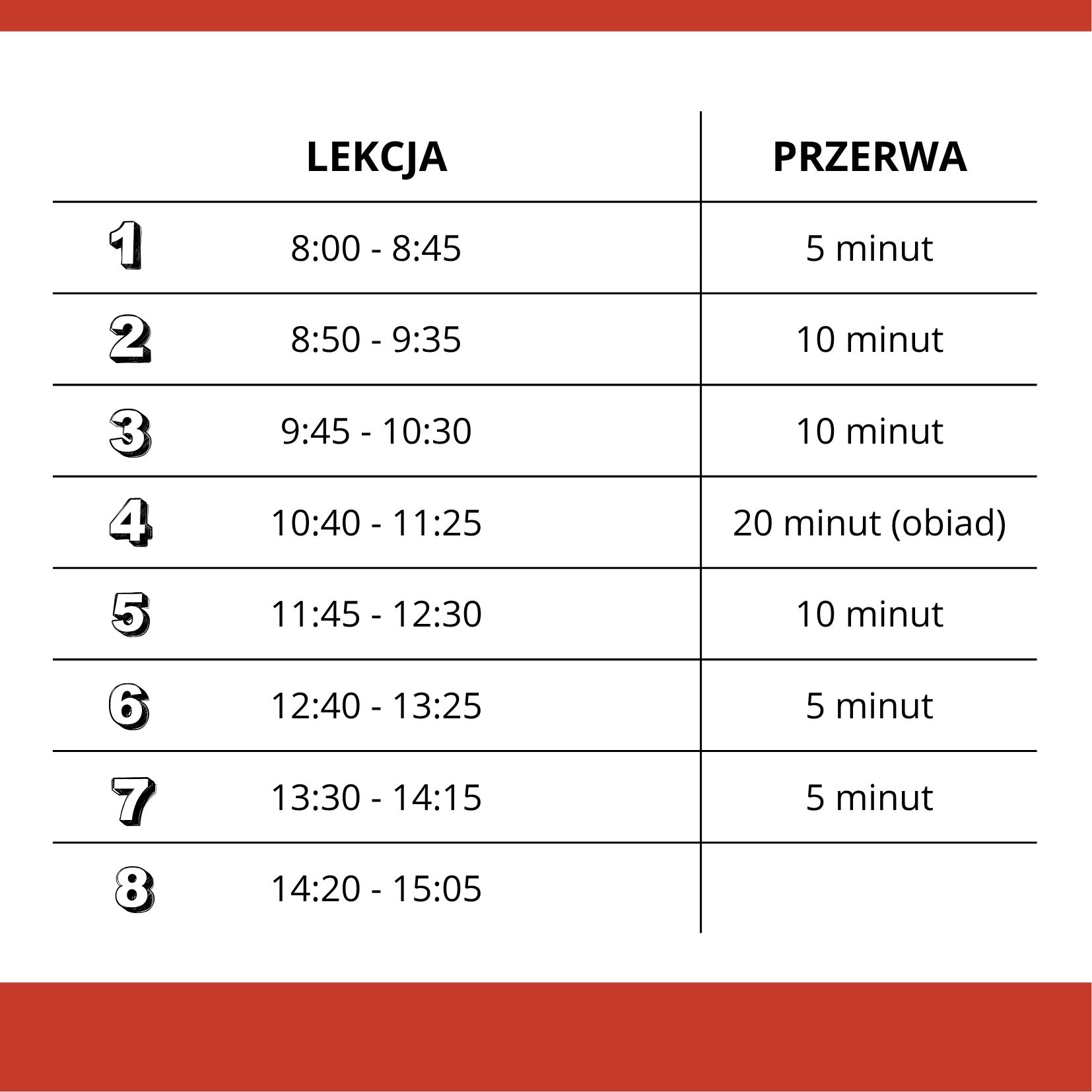 Informujemy, że wprowadziliśmy zmiany w rozkładzie godzin lekcji oraz przerw.