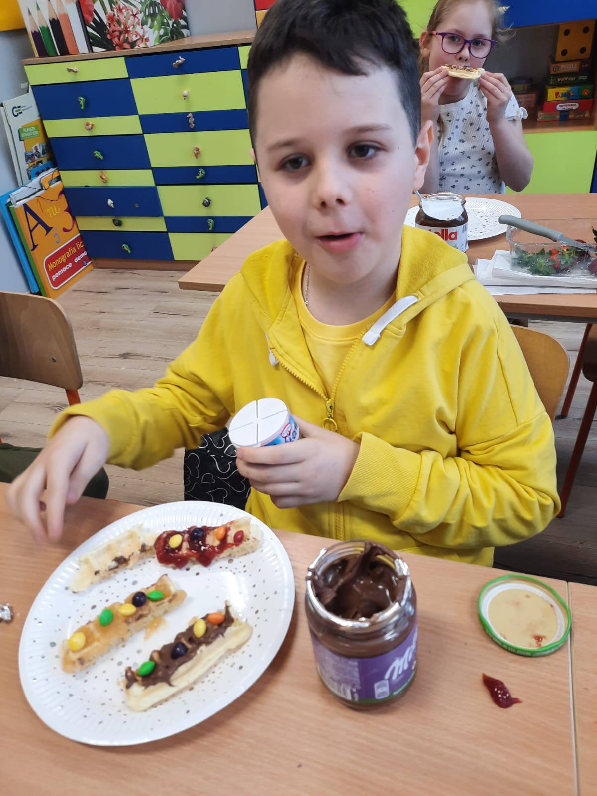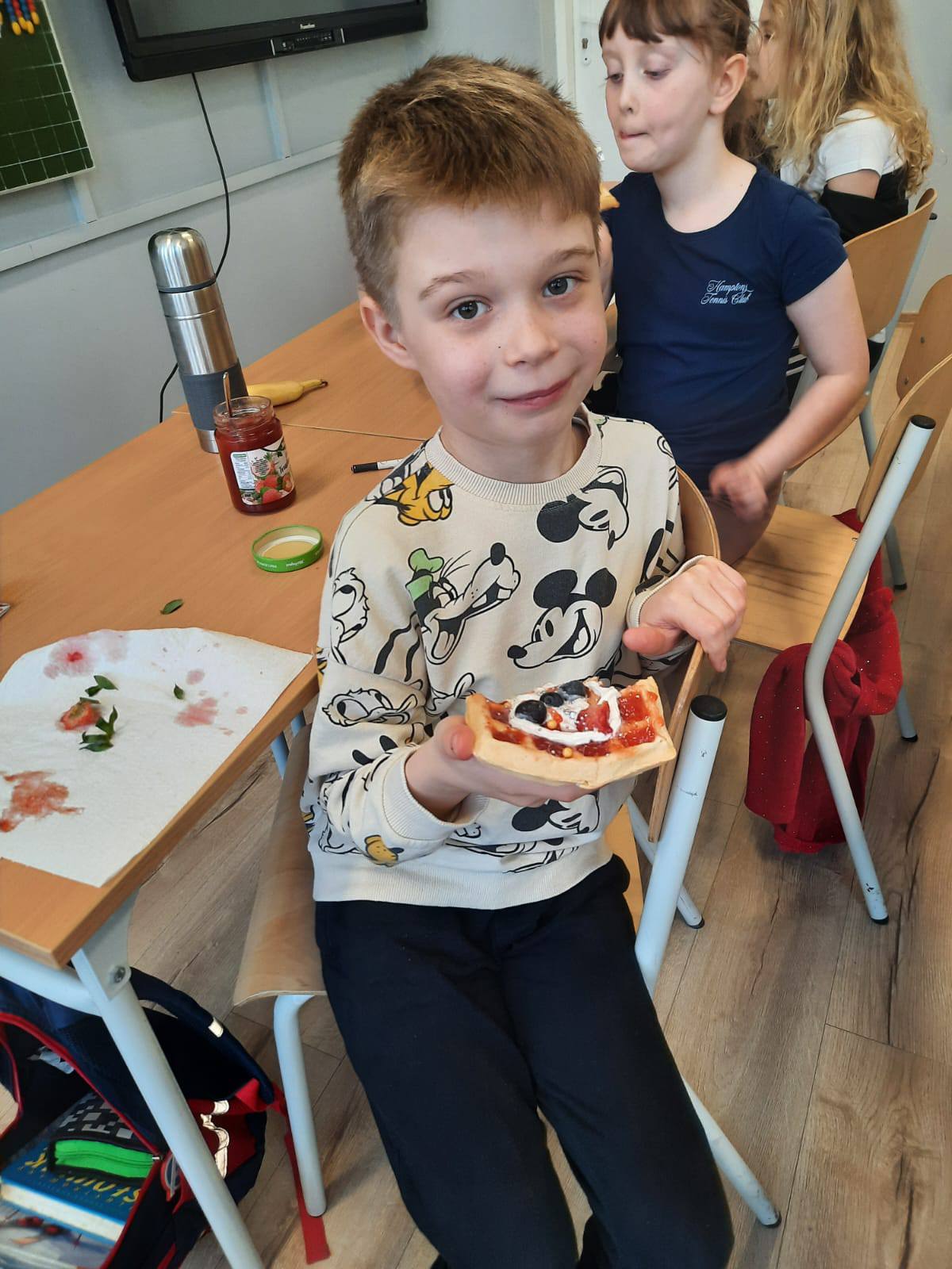 Przygotowanie gofrów w ramach projektu „Zdrowie na talerzu” to dla drugoklasistów cenna lekcja świadomego odżywiania. Dzieci uczą się, jak zastępować cukier owocami, a zwykłą mąkę jej pełnoziarnistym odpowiednikiem, co promuje zdrowe nawyki żywieniowe. Podczas zajęć uczniowie rozwijają kompetencje matematyczne poprzez odmierzanie składników oraz polonistyczne, czytając przepis ze zrozumieniem. Praca w grupach buduje umiejętność współpracy, a samodzielne korzystanie z przyborów kuchennych rozwija sprawność manualną i poczucie odpowiedzialności. Finał projektu, czyli wspólna degustacja, uczy dzieci kultury spożywania posiłków i daje ogromną satysfakcję z własnoręcznie wykonanej pracy.