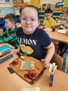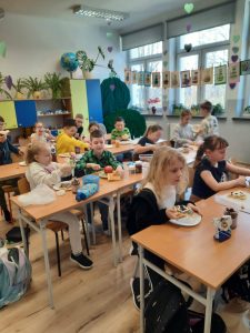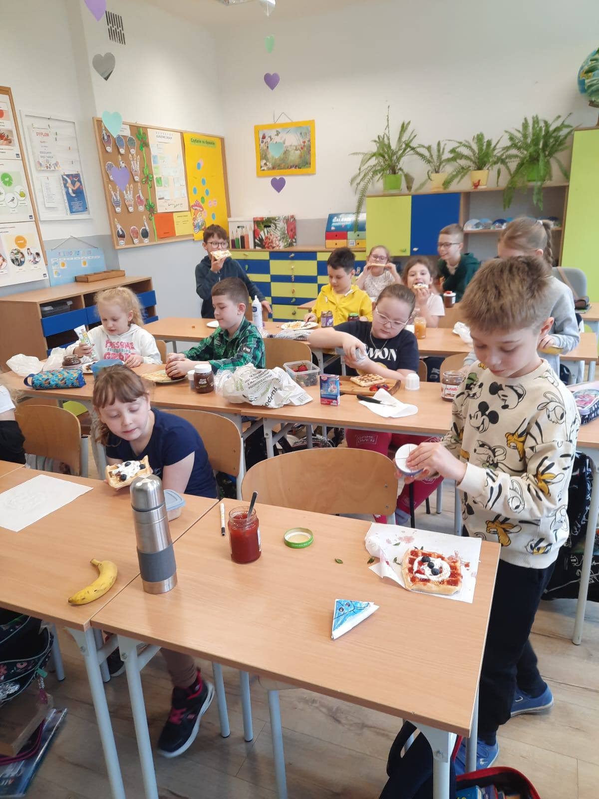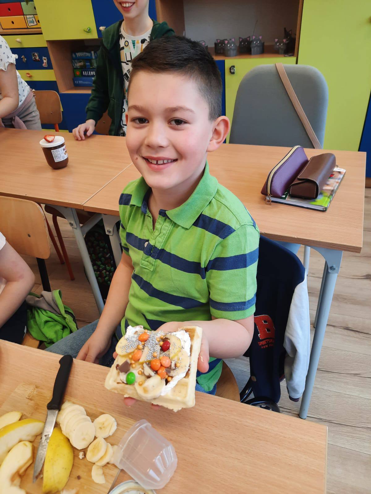 Kolejnym działaniem w ramach projektu ZDROWIE NA TALERZU było przygotowanie i dekorowanie gofrów. Uczniowie drugiej klasy, pod czujnym okiem wychowawczyni, zamienili się w cukierników.
