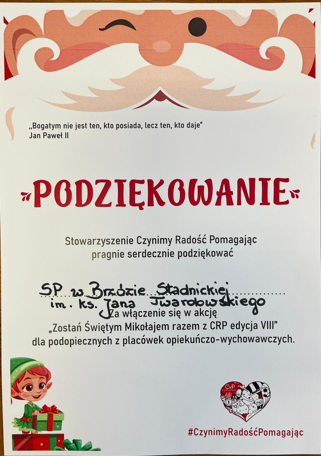 W przedświątecznym okresie Szkolne Koło Wolontariatu wraz ze Stowarzyszeniem „Czynimy Dobro Pomagając” zorganizowało akcję pod hasłem „Czynimy radość, pomagając”. Jej celem była zbiórka słodyczy dla dzieci z placówek opiekuńczo-wychowawczych, by z okazji mikołajek obdarować najmłodszych słodkim upominkiem.